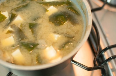 d) Se a preferência for por pedaços menores de alga, colocá-la de molho em um pouco de água e, assim que amolecer, picar em pedaços e menores e acrescentar à sopa. A água em que a alga ficou de molho pode ser também acrescentada ao caldo. Se não tiver wakame em casa, pode-se fazer o missoshiro na sua forma mais básica, apenas com tofu e cebolinha.