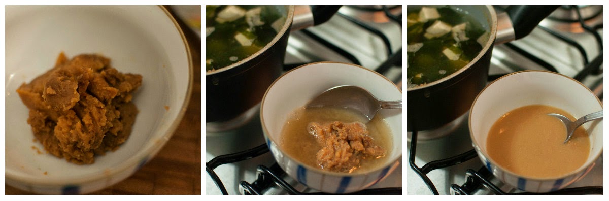Em seguida, misturar o missô diluído no caldo, desligando o fogo imediatamente. É importante que o missoshiro não ferva depois de colocar o missô, pois pode perder propriedades, além de ficar mais salgado.