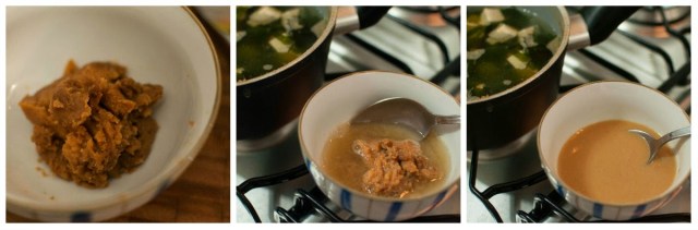 Colocar a pasta de missô em um recipiente, pegar um pouco do caldo do missoshiro e usá-lo para diluir a pasta.